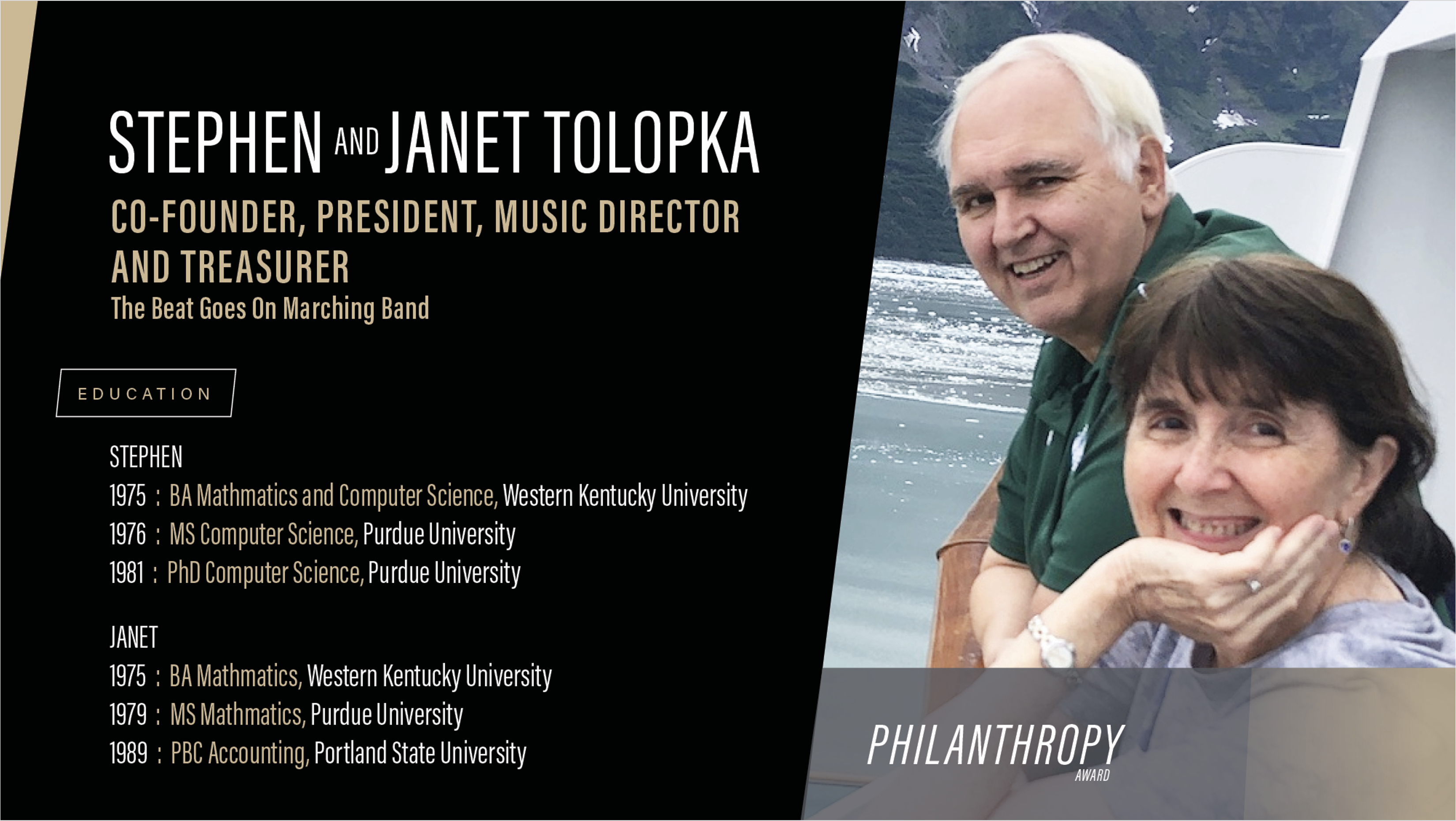 Dr. and Mrs. Tolopka serve on the Board of Directors as board president / music director and treasurer (respectively) for The Beat Goes On Marching Band and have performed with the band at major events in locations as far-flung as Calgary, San Antonio, San Francisco, Alaska, the Netherlands, and Shanghai. Mrs. Tolopka also serves as a board member and treasurer for The Immigrant Story, a small nonprofit that features accomplishments of immigrants. The Tolopka’s have supported many areas of Purdue over the years, including the President’s fund, Women in Science, and the Department of Computer Science, as well as naming the Tolopka Terrace in the Lawson Computer Sciene building. They are also active members in Purdue’s Griffin Society and President’s Council.