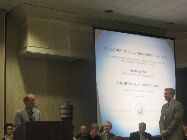 Below is a picture of me giving a brief acceptance speech, followed by a picture of awardees (including me) listening to Scott Annin give his speech for the Alder Award. David Bressoud, president of the MAA, is standing off to the right, listening to the acceptance speech. Not having a group of students and friends at the meeting, as did Scott, I had no one to take such a photo of me showing the overhead projector screen with my announcement. But you get the idea of how the ceremony went.