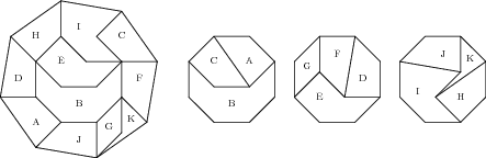 While the 24-piece dissection of three octagons to one in Plate 94 is translational, my 10-piece dissection in Figure I94 is not translational. Below is an 11-piece dissection that is translational.