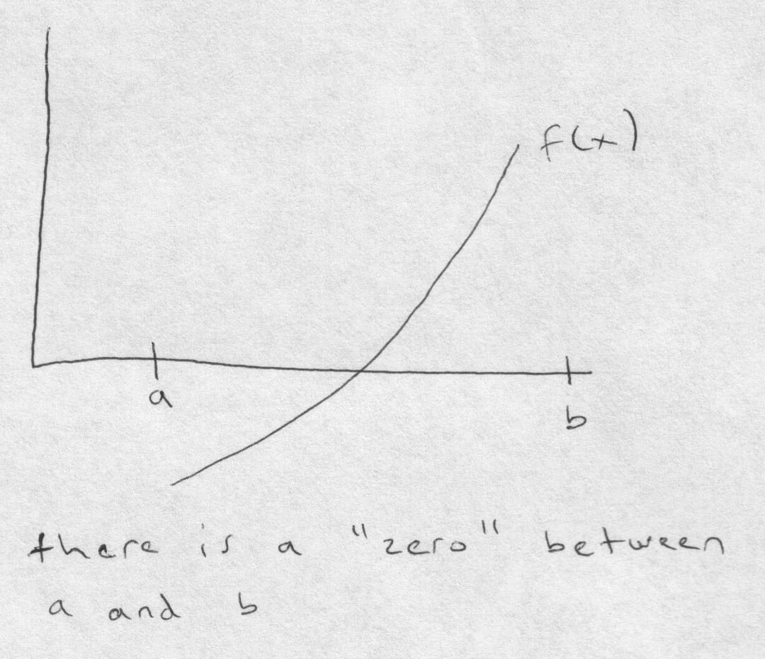 - starting with two values a,b (an interval) such that a < b and f(a) < 0 and f(b) > 0 or f(a) > 0 and f(b) < 0, this means there is an x such that a <= x <= b and f(x) = 0