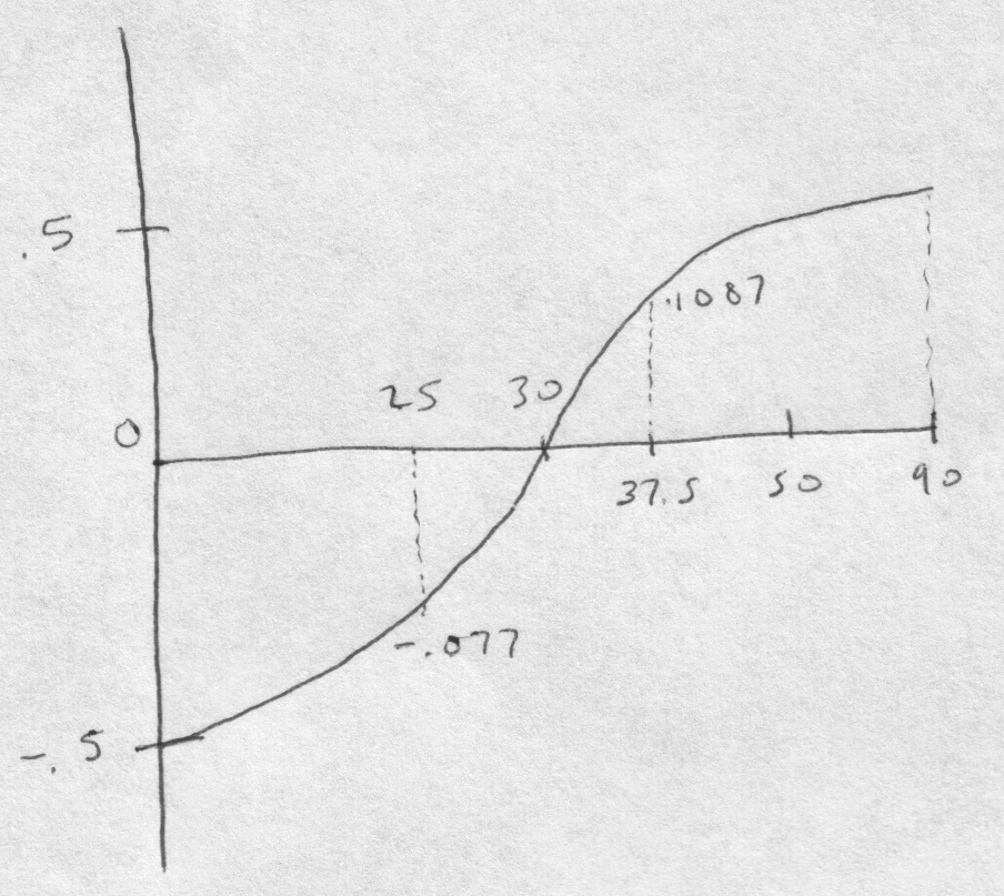 - f(0) = 0 - .5 = -.5 , f(50) = .266