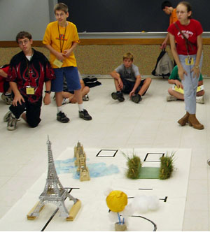 Advanced camp also built lego robots. However, their competition further honed their programming skills. Their bots had to be programmed to go Around the World in 80 days. Camp staff assembled an obstacle course campers had to navigate their robots through. The course included traveling through the London Bridge, following a line under the Eiffel Tower, and crossing a ramp through the jungle. Points were awarded for each task based upon the level of difficulty and the level of completion.