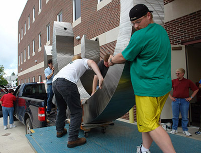 A number of students assisted Mishler in moving spiral into the commons. Sophomore MIke Nichols was one of the student helpers who assisted in the move. Nichols remarked "It was definitely interesting moving the sculpture because it was awkward and it required a lot of teamwork to get it through the doors." The pieces had to be turned on their sides, strapped to carts, and then rolled and rotated to maneuver through the narrow opening.