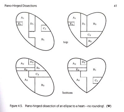 Piano-hinged dissections differ from standard dissections in that standard dissections cut a geometric shape into a number of pieces that can be rearranged to form a second shape. In a piano-hinged dissection, the pieces are attached together so that you can use a folding motion to move the pieces from one shape to the other. The term "piano-hinged" comes from the long, narrow hinge that connects the lid of a grand piano to its sound box. A fun example from the book is in figure 4.5 (click the diagram pictured for a larger version) which transforms an ellipse into a heart with just a few folds. This folding motion is reminiscent of what you see in origami, the Japanese art of paper-folding.